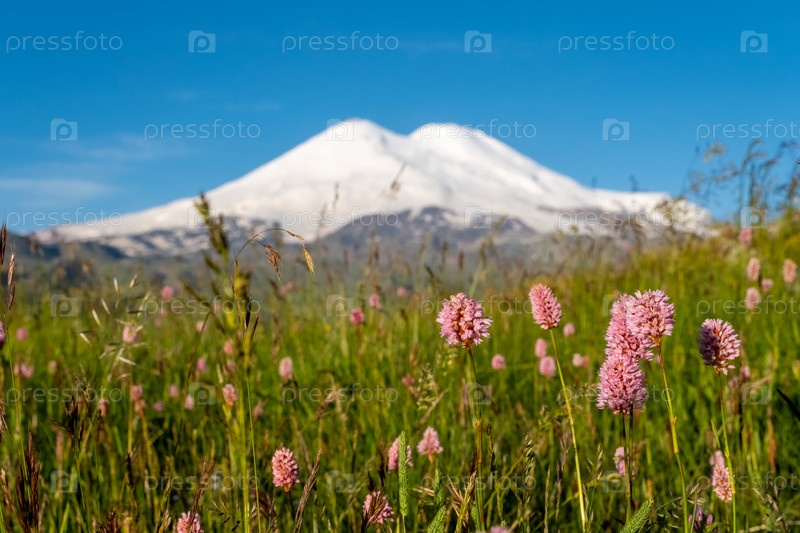 Гора Эльбрус и цветы, Кавказ