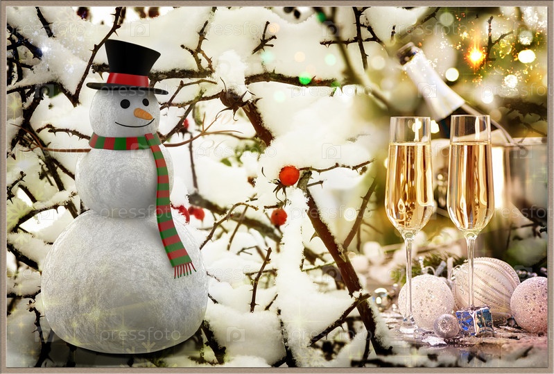 Рождественская сказка: снеговик и шампанское на фоне заснеженных деревьев. 3D-рендеринг. открытка с рамкой