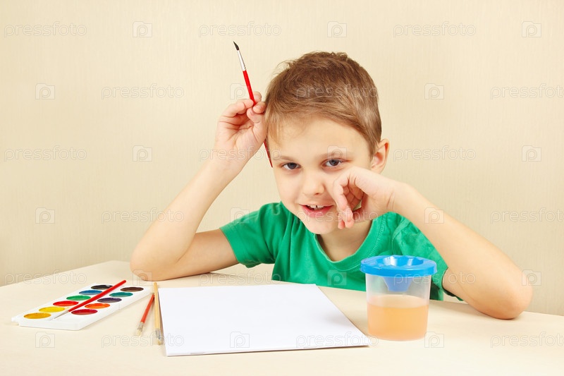 Маленький художник в зеленой рубашке собирается рисовать красками
