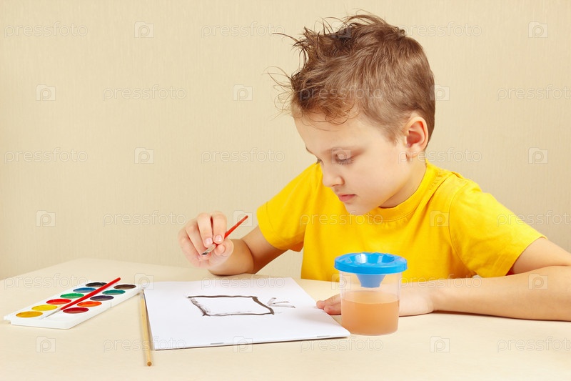 Мальчик в желтой рубашке рисует акварелью