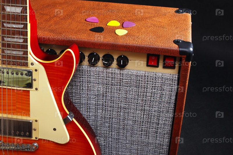 Гитарный усилитель с медовой гитарой солнечных лучей на черном фоне