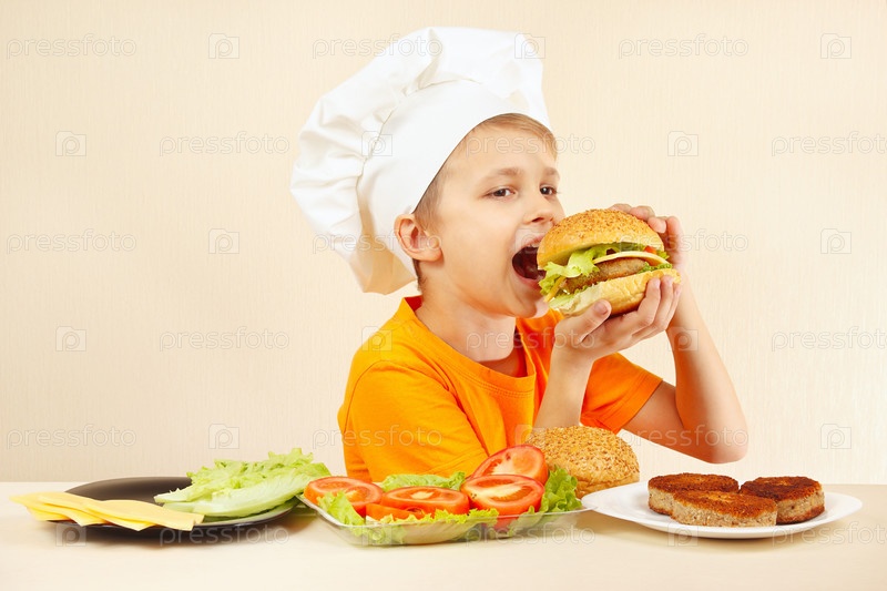 Маленький улыбающийся мальчик в шляпе шеф-повара пробует приготовленный гамбургер