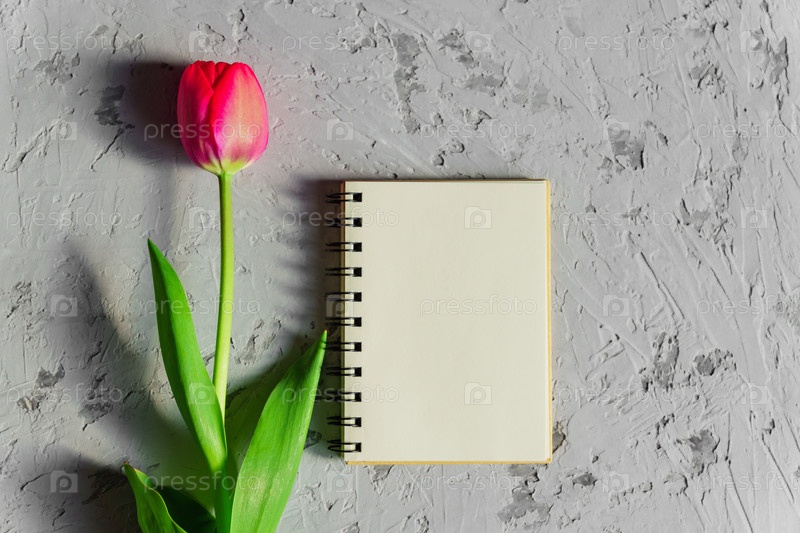 Красивый свежесрезанный розовый тюльпан и пустая спиральная записная книжка на сером бетонном фоне. Макет с копией пространства