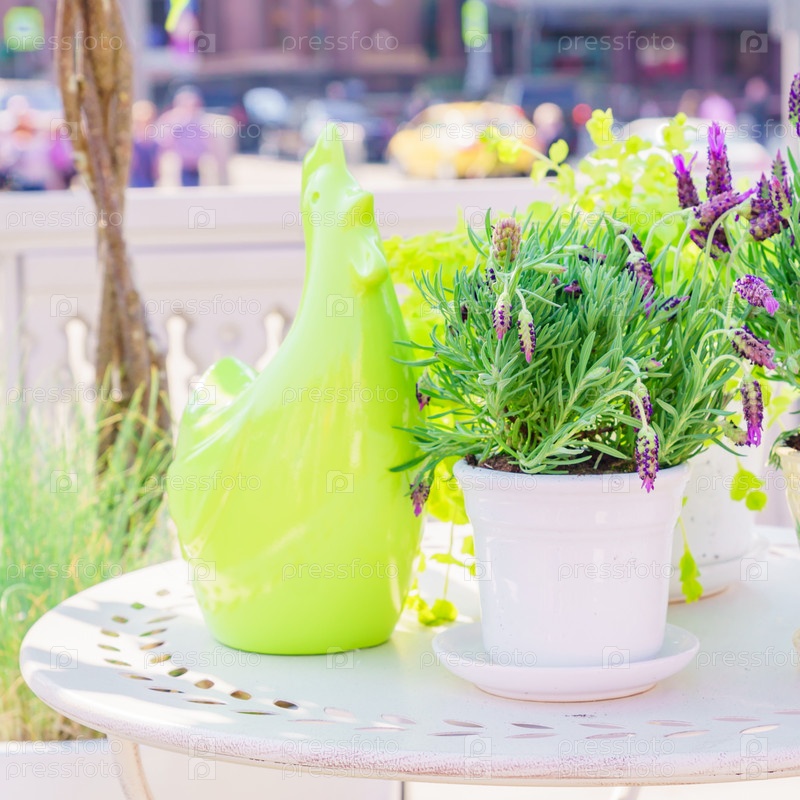 Зеленая керамическая статуэтка петуха и цветущей лаванды в белых горшках на садовом столе. Красивое обустройство сада
