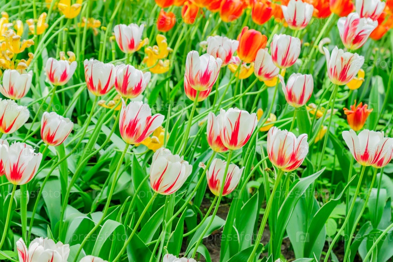 Крупный план цветущих весенних тюльпанов разных цветов