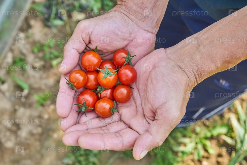 Мужские руки собирают свежие помидоры в саду в солнечный день. Фермер собирает органические помидоры. Концепция выращивания овощей