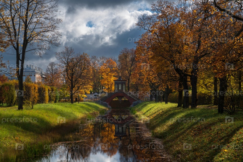 Поперечный мост (Крестовый мост) в Александровском парке Царского Села в солнечный осенний день, Пушкин, Санкт-Петербург, Россия