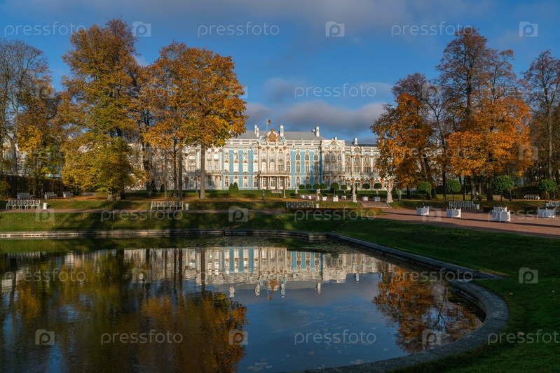 Вид на Екатерининский дворец с отражением в Зеркальном пруду Екатерининского парка в Царском Селе в солнечный осенний день, Пушкин, Санкт-Петербург, Россия