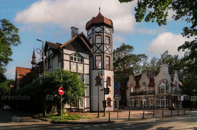 Вид на ТЦ "Раушен" и магазин "Русский янтарь" на Центральной площади в солнечный летний день, Светлогорск, Калининградская область, Россия
