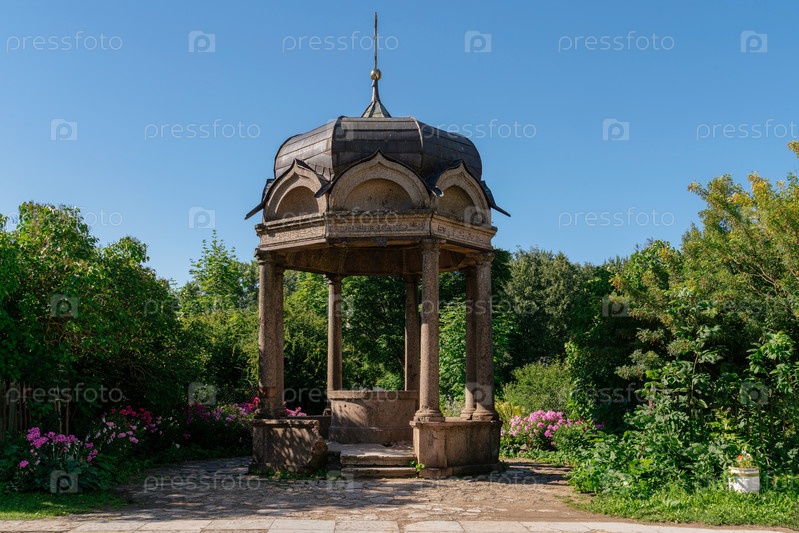 Вид на киворий (навес над родником) в Георгиевском (Юрьевском) монастыре в солнечный летний день, Великий Новгород, Россия