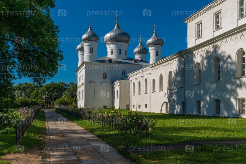 Вид на Спасский собор Георгиевского (Юрьевского) монастыря и киворий (навес над родником) в солнечный летний день, Великий Новгород, Россия