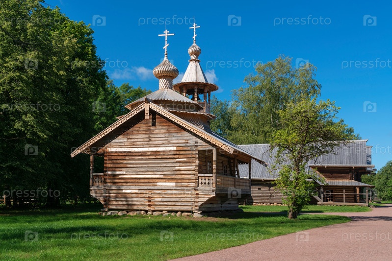 Вид на часовню Кирика и Юлиты в Новгородском музее народного деревянного зодчества Витославлица в солнечный летний день, Великий Новгород, Россия