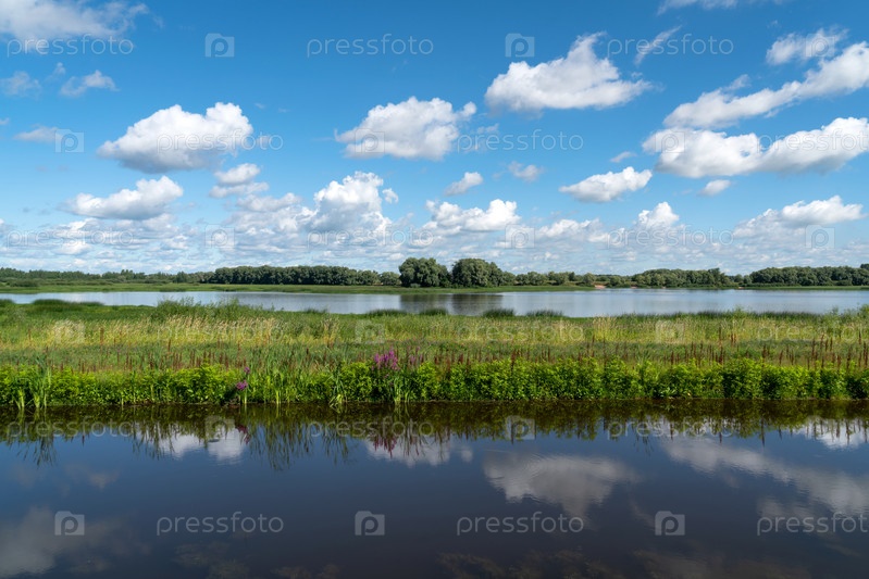 Вид на реку Волхов в солнечный летний день, деревня Витославлицы, Великий Новгород, Россия