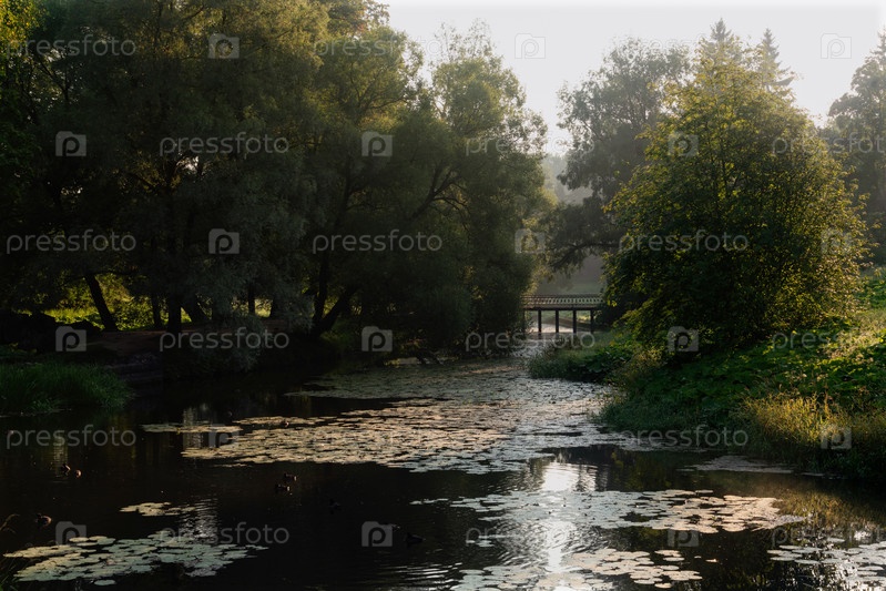 Вид на реку Славянку и Черный мост в Павловском парке солнечным туманным летним утром, Павловск, Санкт-Петербург, Россия