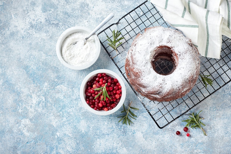 Шоколадный торт, посыпанный сахарной пудрой на металлической решетке, сахарная пудра и клюква в мисках, подготовленные для украшения