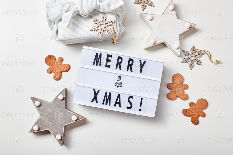 Световая коробочка с надписью "Счастливого Рождества", подарки в японском стиле фурошики и пряники