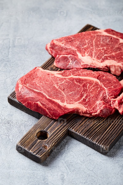 Два свежих сырых мяса Prime Black Angus Beef Steaks, Rib Eye, Денвер, на деревянной разделочной доске