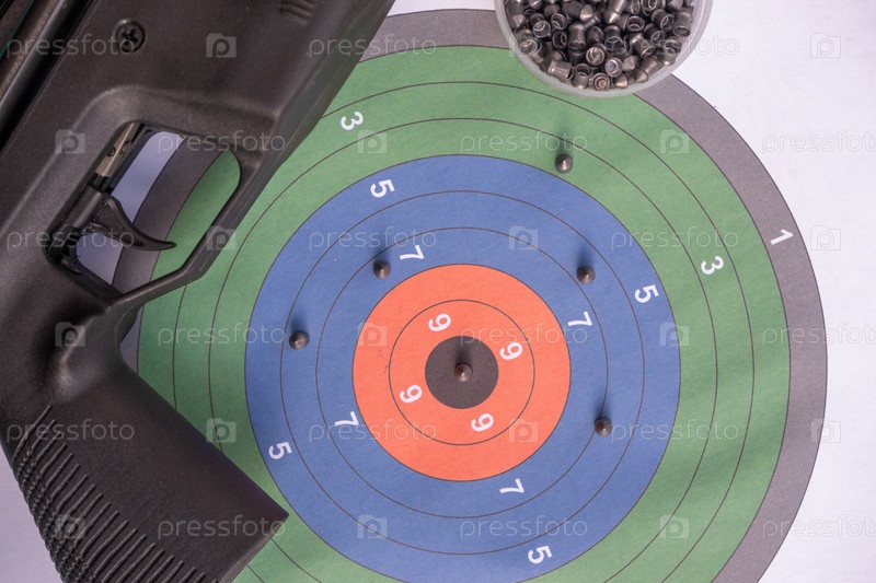 Пневматическая стрельба. пневматическая винтовка и пули на фоне цветной мишени