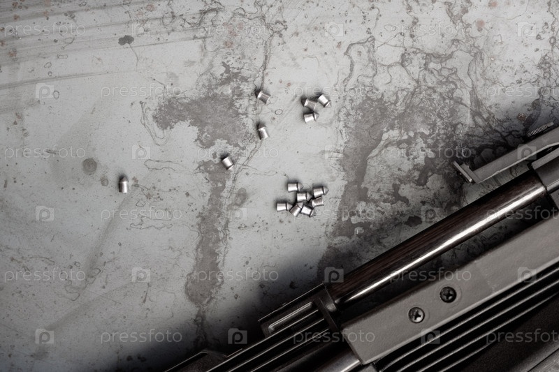 Пневматическая стрельба. пневматическая винтовка и пули на стальном столе. На фоне стали крупным планом лежит черная пневматическая винтовка, рядом разбросаны патроны