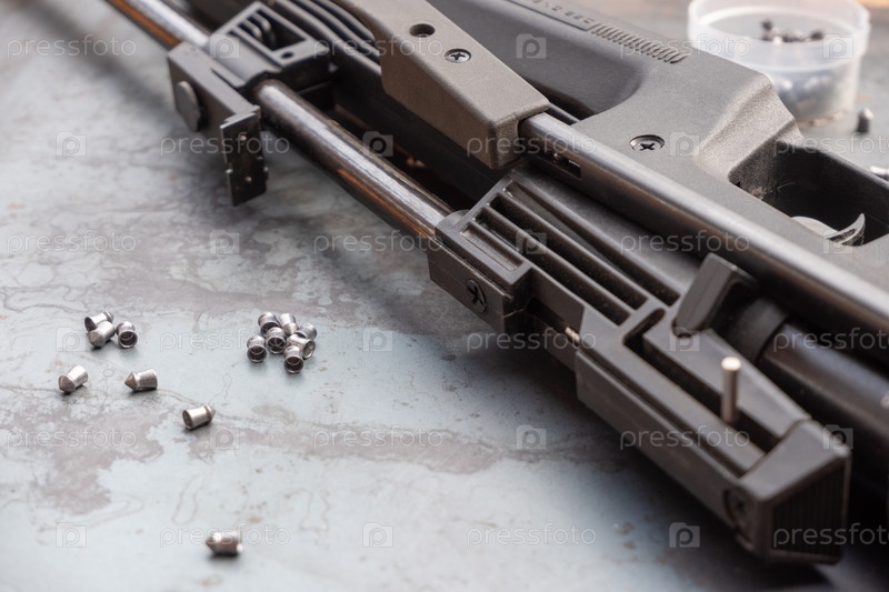 Пневматическая стрельба. пневматическая винтовка и пули на стальном столе. На фоне стали крупным планом лежит черная пневматическая винтовка, рядом разбросаны патроны