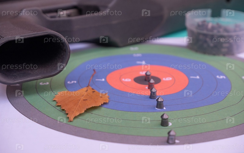 Пневматическая стрельба. пневматическая винтовка и пули на фоне цветной мишени