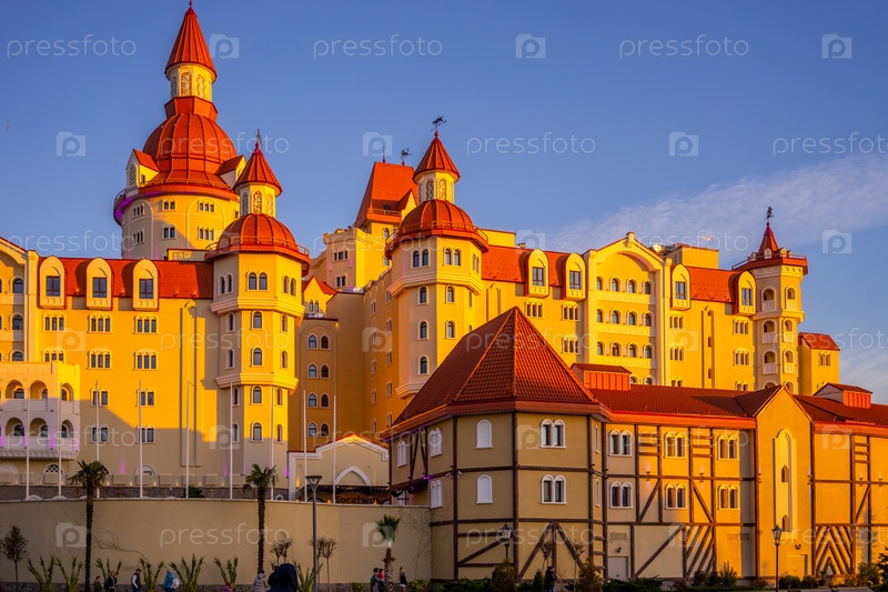 Городской пейзаж с видом на отель в виде замка