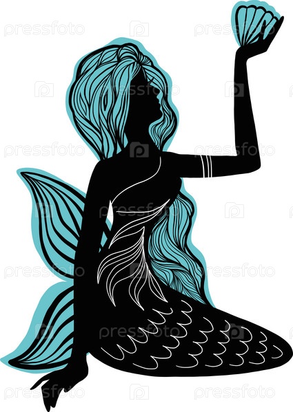Силуэт русалки с логотипом, сидящей с ракушкой. Изолированная фигура девушки из сказки
