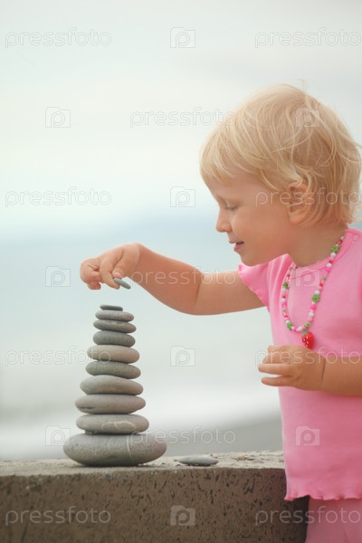 Девочка строит пирамиду из гальки