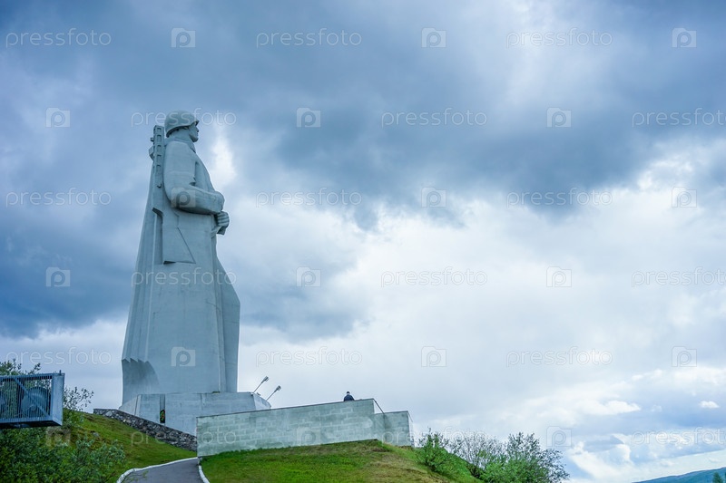 Мурманск, Россия-5 июня 2015 г.: Пейзаж с видом на мемориал советскому солдату