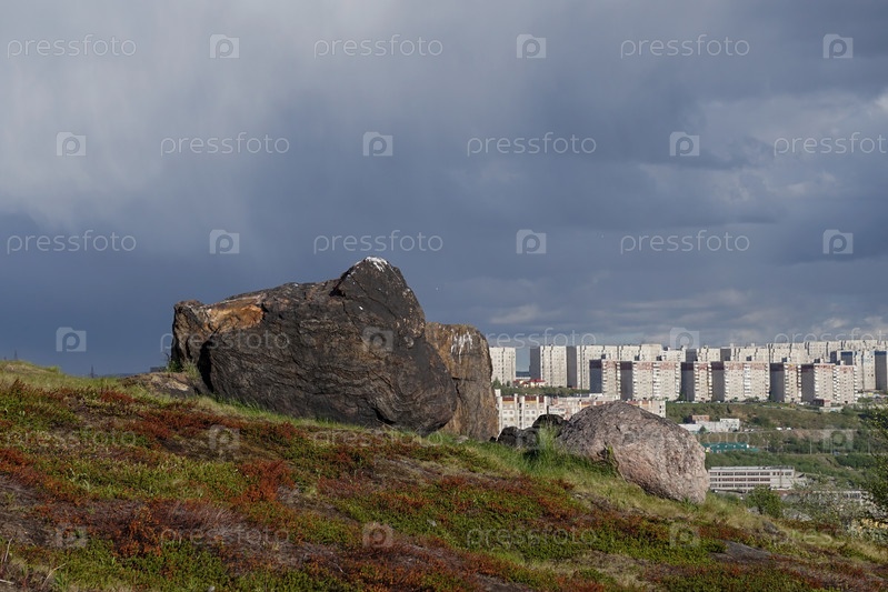 Мурманск, Россия-5 июня 2015 г.: Городской пейзаж Мурманской советской архитектуры и яркая листва лета