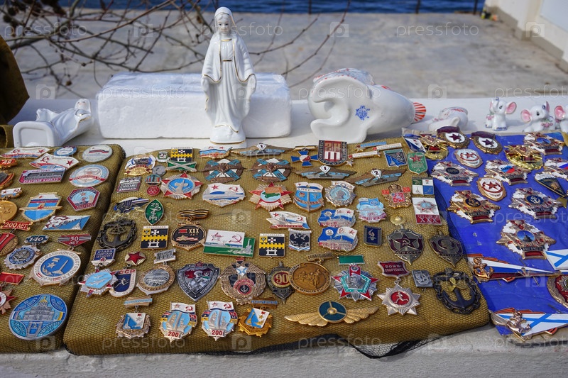 Севастополь, Крым-16 марта 2018 г.: Уличная распродажа коллекции икон и статуй разных типов