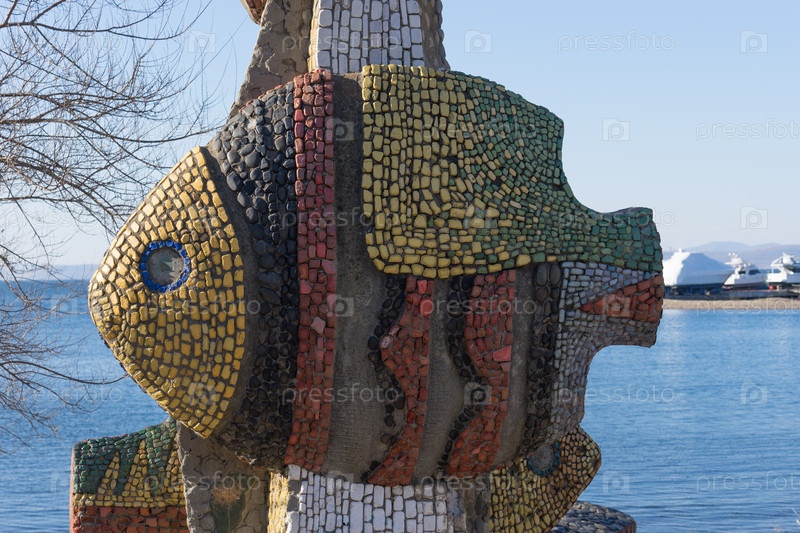 Владивосток, Россия-1 декабря 2018 г.: украшение набережной в виде фигурок рыб мозаикой из цветных камней