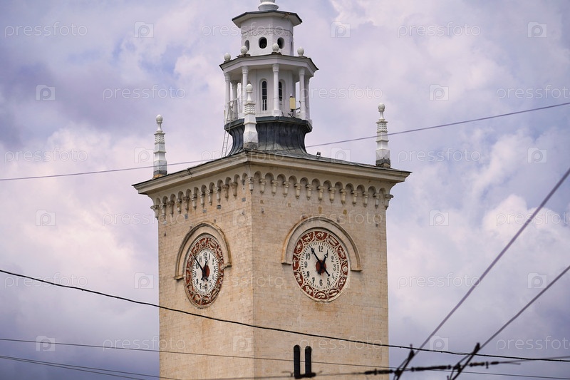 Симферополь, Крым-6 июня 2021 г.: Пейзаж с видом на старинные часы на башне железнодорожного вокзала