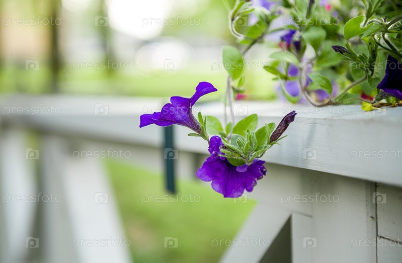 Цветок петунии на белом деревянном крыльце