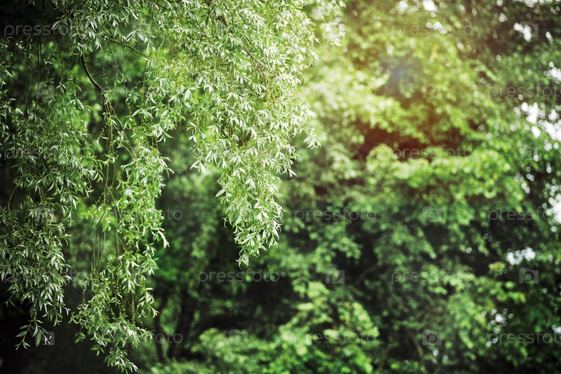 Ветви деревьев и естественный зеленый фон размыты. Фоновое изображение летнего парка и летний свет