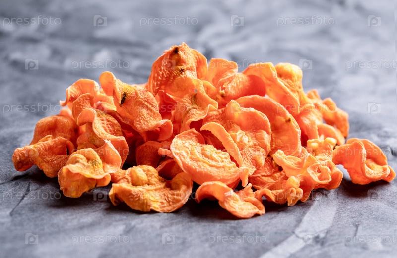 Вид спереди на небольшую кучу оранжевых морковных чипсов на помятой черной бумаге