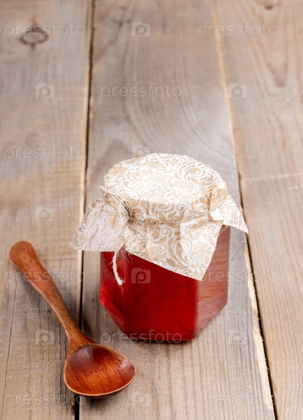 Закрытая стеклянная банка с клубничным вареньем и деревянной ложкой на старом деревянном столе