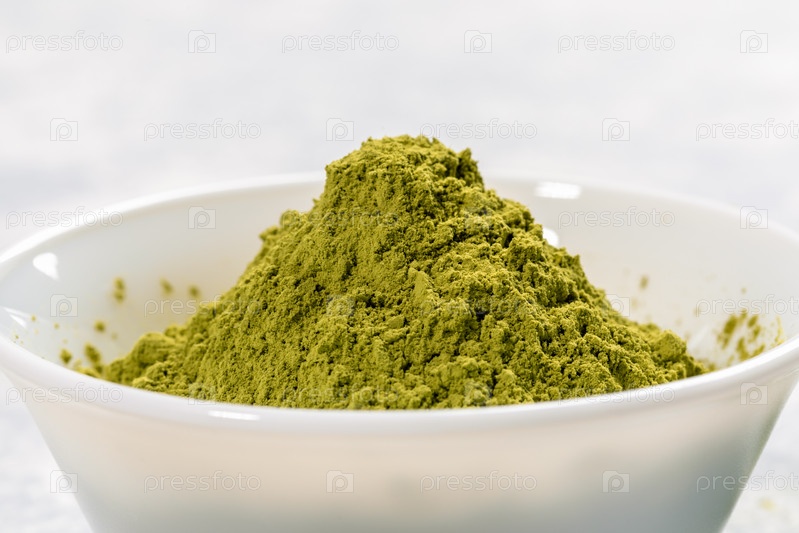 Чаша конца-вверх белая полная зеленого японского порошка чая маття на белой предпосылке. Источник антиоксидантов для здоровья