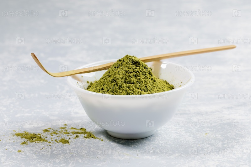 Куча с горкой зеленого порошка чая маття в белой миске со специальной деревянной бамбуковой ложкой на сером текстурированном фоне