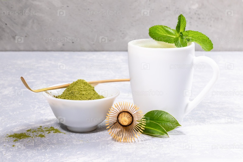 Белая чашка с зеленым чаем матча, порошок со специальной деревянной ложкой, бамбуковый венчик, свежие листья на сером фоне