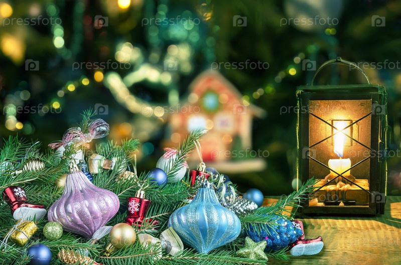 Украшенные еловые ветки и фонарь со свечой на фоне елки