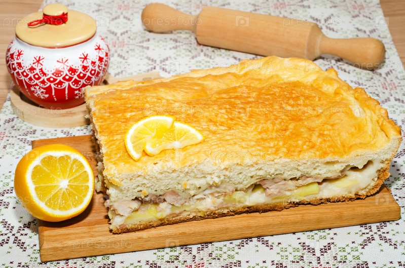 Пирог с куриным мясом, картофелем, луком, лимоном и специями на деревянной разделочной доске. здоровое питание обед или ужин
