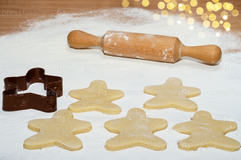 Сырые имбирные пряники выкладывают поверх муки. Выборочный фокус