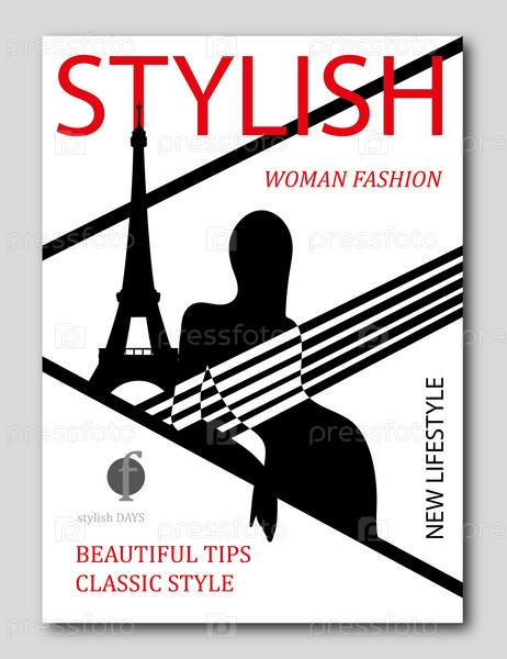 Абстрактная женщина в полосатом топе в Париже с Эйфелевой башней. Дизайн обложки модного журнала