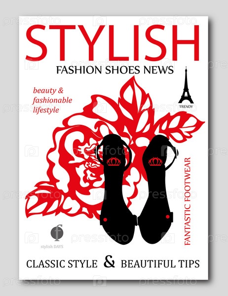 Мода модный силуэт черные туфли на высоком каблуке с розой на фоне. Дизайн обложки модного журнала