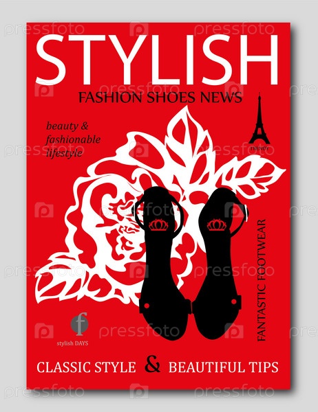 Мода модный силуэт черные туфли на высоком каблуке с розой на фоне. Дизайн обложки модного журнала