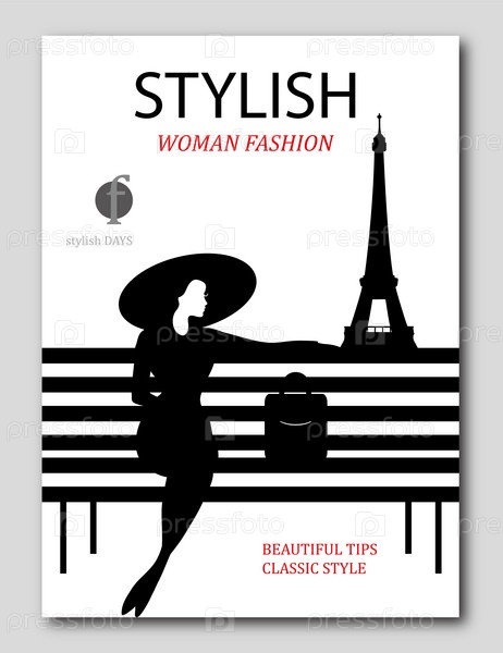Абстрактная женщина в большой шляпе и сумке на скамейке в Париже. Дизайн обложки модного журнала