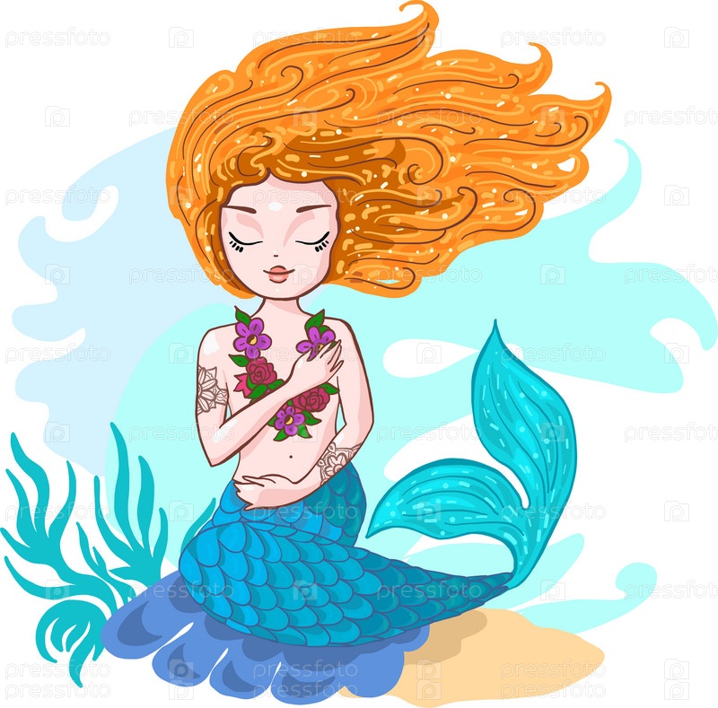 Милая рыжая русалка в медитации и расслаблении