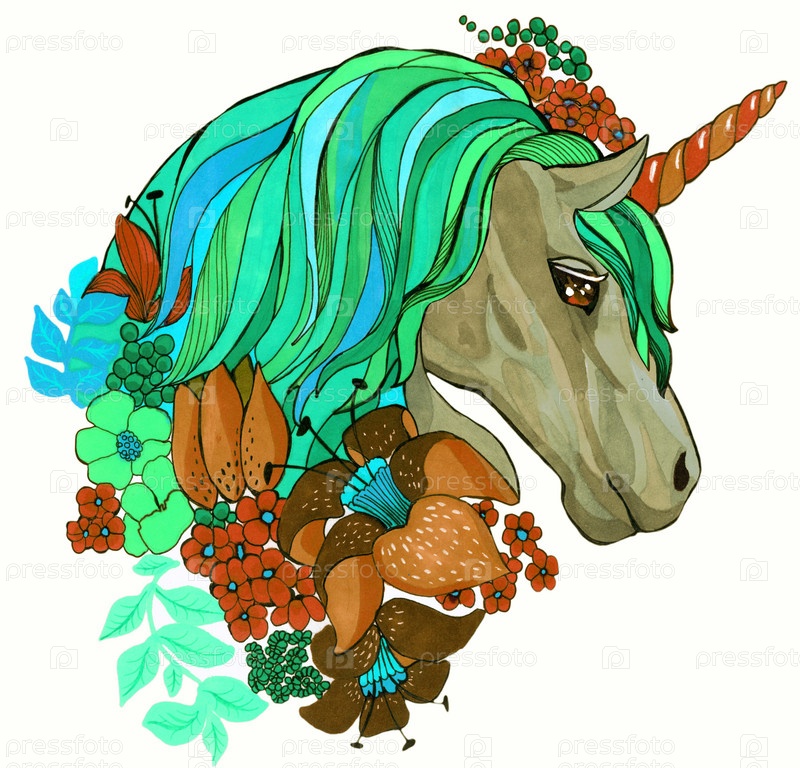 Волшебный портрет единорога с цветами ручной рисунок иллюстрации