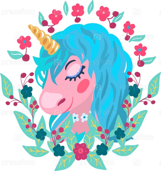Волшебный милый маленький портрет единорога с векторным рисунком цветов